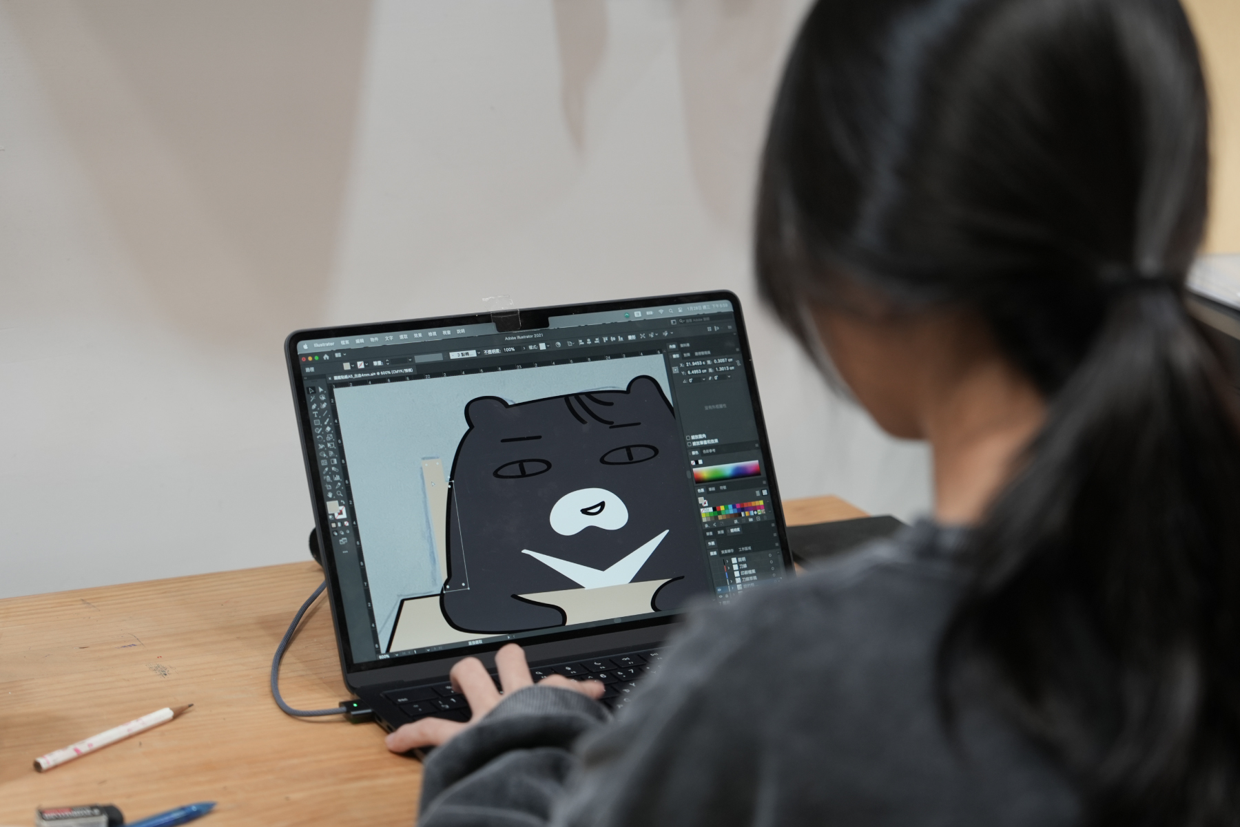 把草稿放進電腦,一筆一畫勾勒出清楚的邊框,再配上最適合三毛熊的顏色。