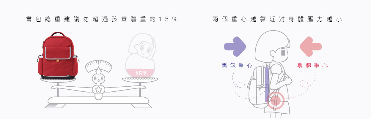 充份分散背包的重量的另一個好處,是讓孩子書包揹的舒服一些,比較不會有肩膀局部受力的不適感,減輕孩子肩上的負擔。
