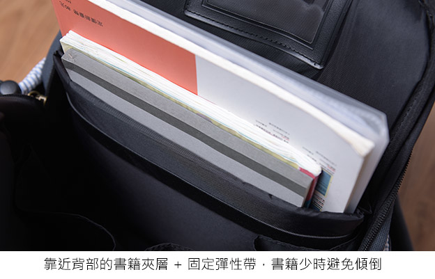 大部份護脊書包都有書籍專用夾層,讓最重的書本靠近身體,這對減輕脊椎壓力很有幫助。我們認為書包不適合太厚,這樣會讓書包裝的更多更重,且書包加厚會讓重心又往後拖重,身體為了保持平衡,會變成往前彎曲駝背的不良姿勢。