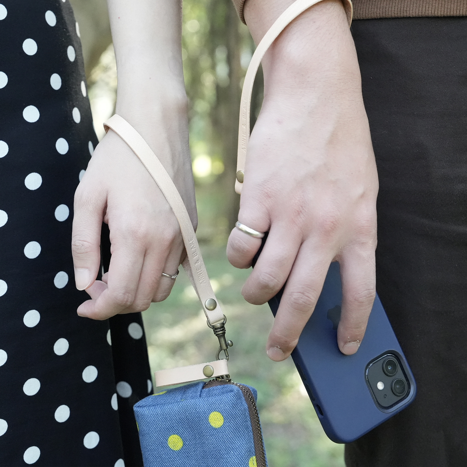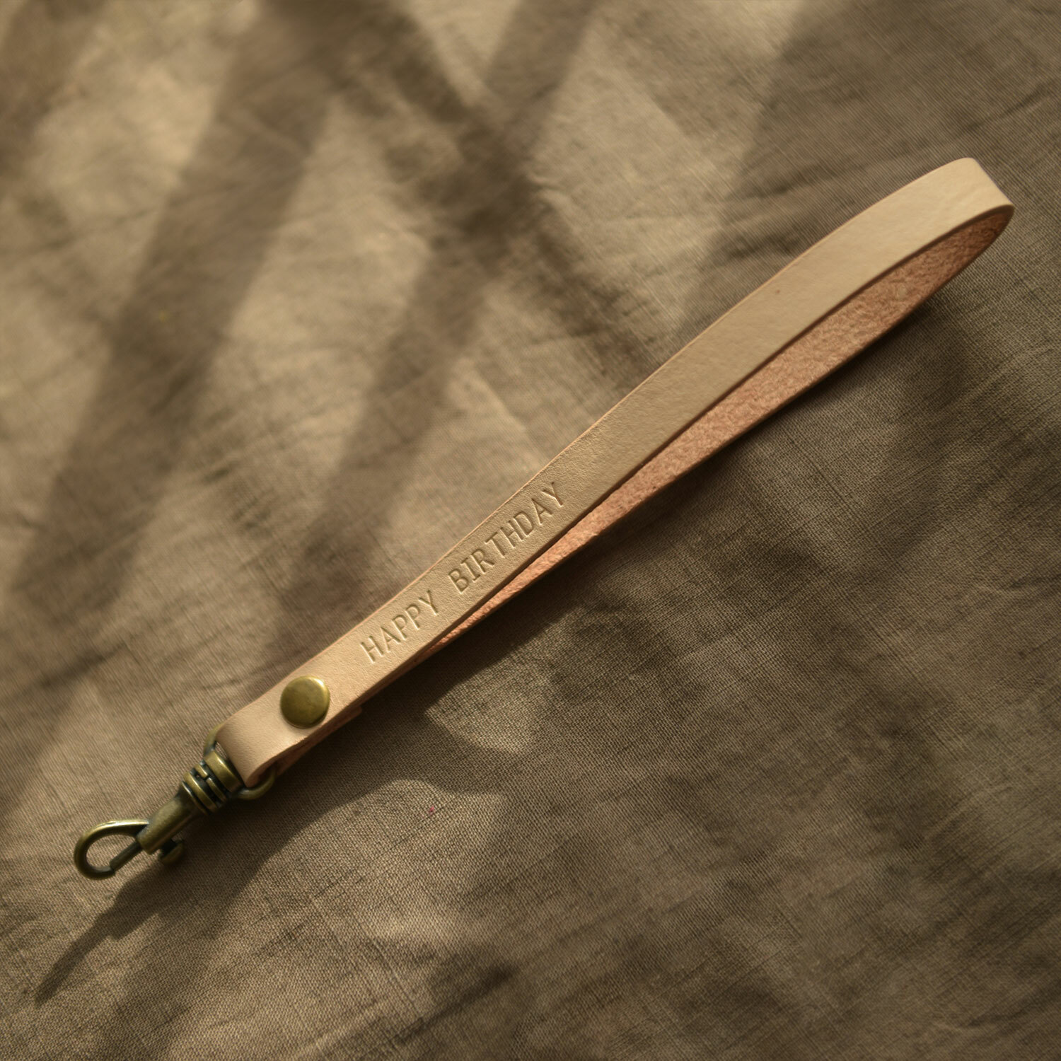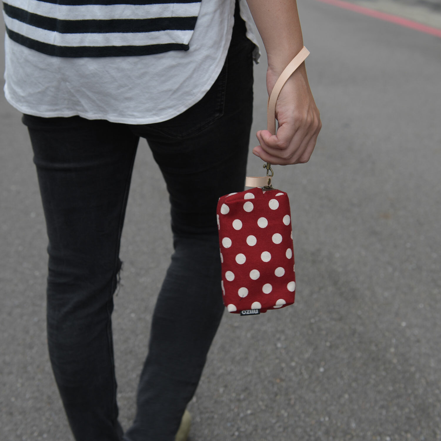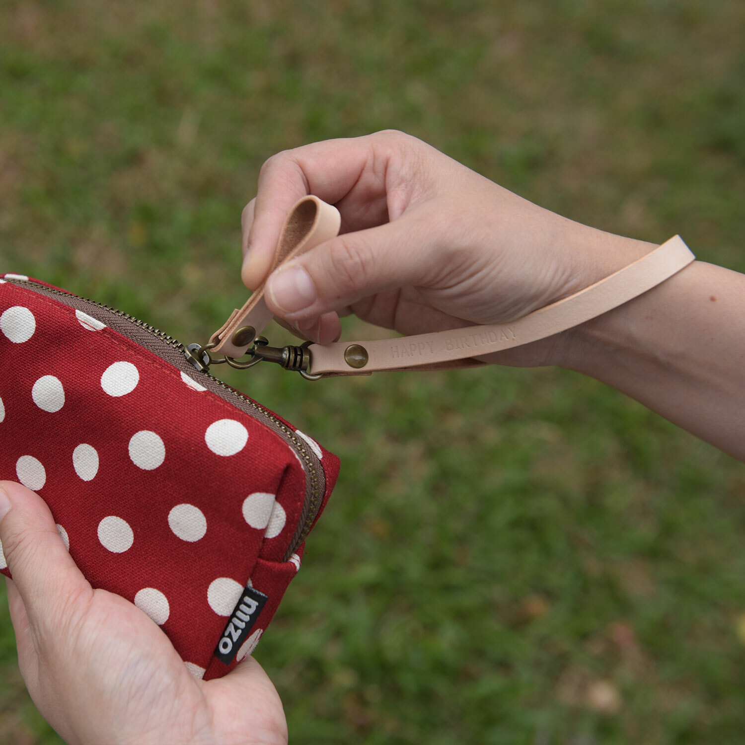 真皮手工製作,前端有勾環五金,可自行勾在包包上使用。