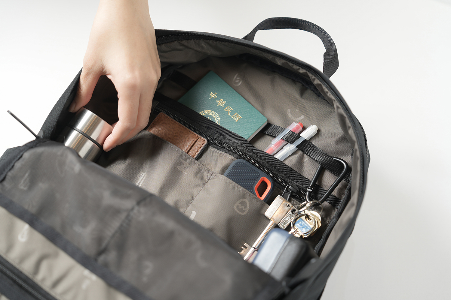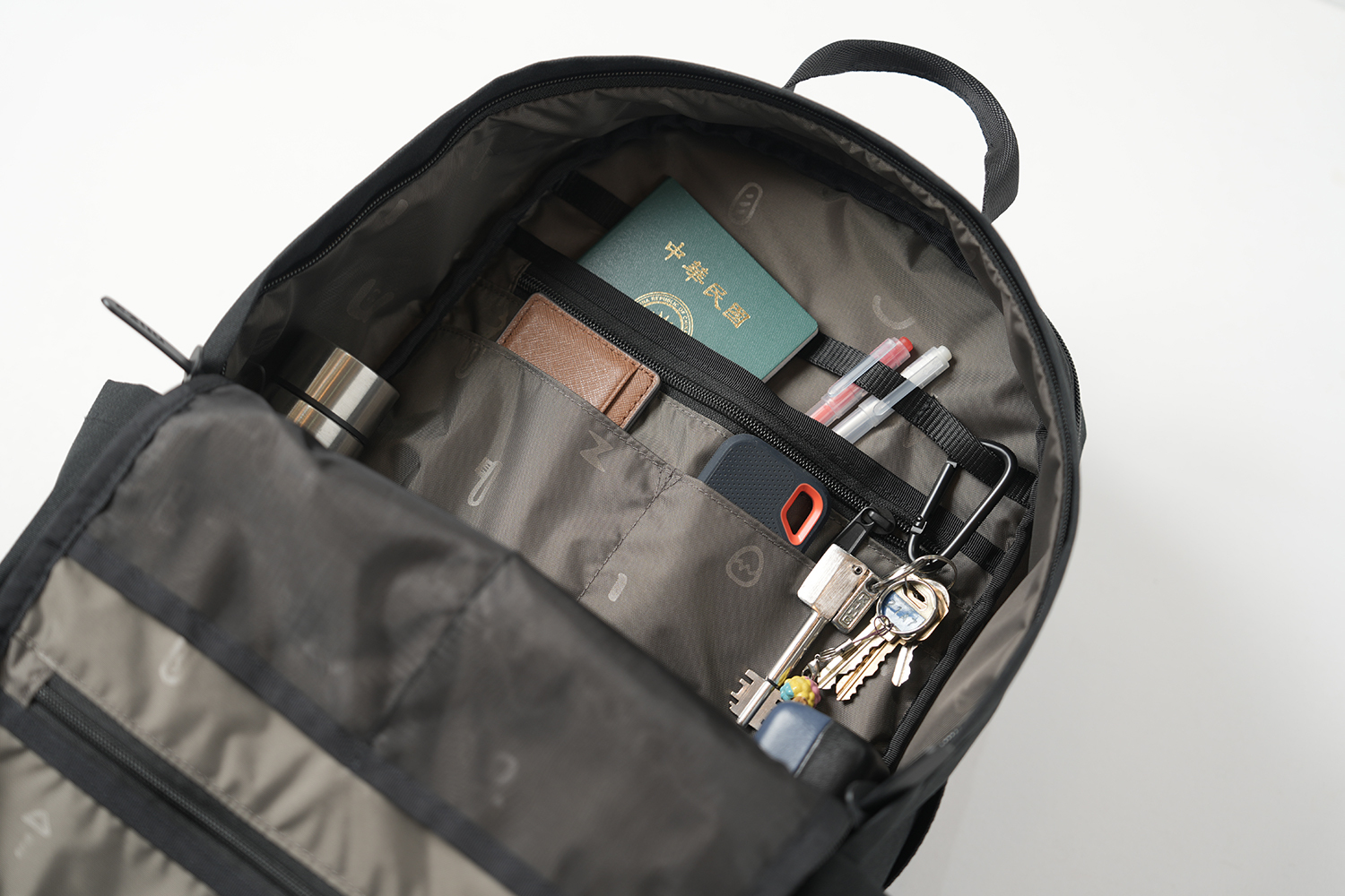 具有獨立四大收納空間設計:➊前方快取小物袋、➋中央收納夾層、➌後背負重夾層、➍後方快取秘密袋。
