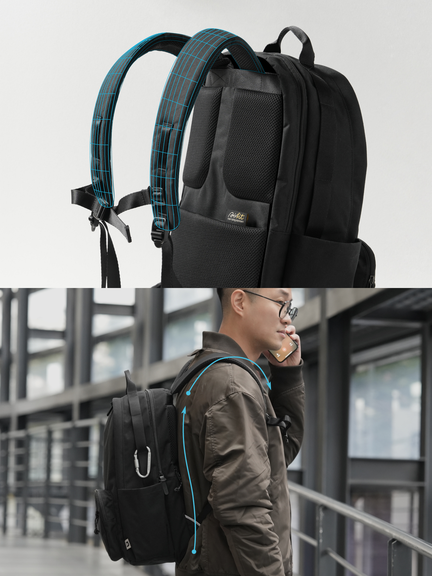 有效減輕背負筆電或書本等硬質物品時,腰部所承受的局部壓力及不適感。