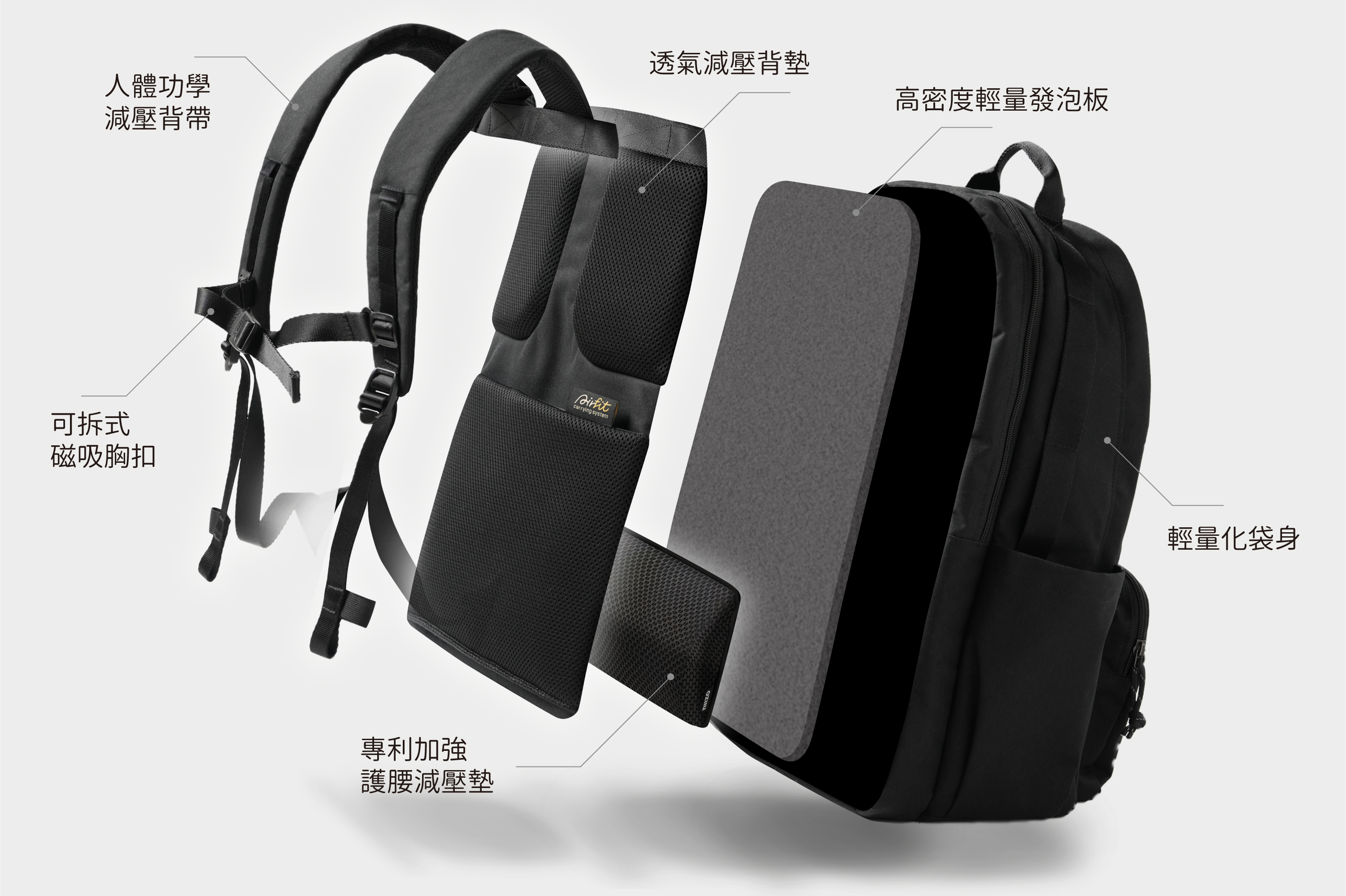 ・背部3點式減壓泡棉 + 高密度輕量發泡支撐板。
