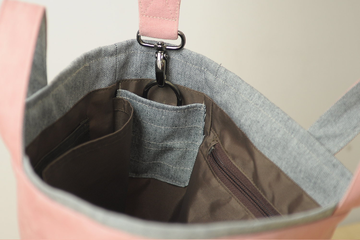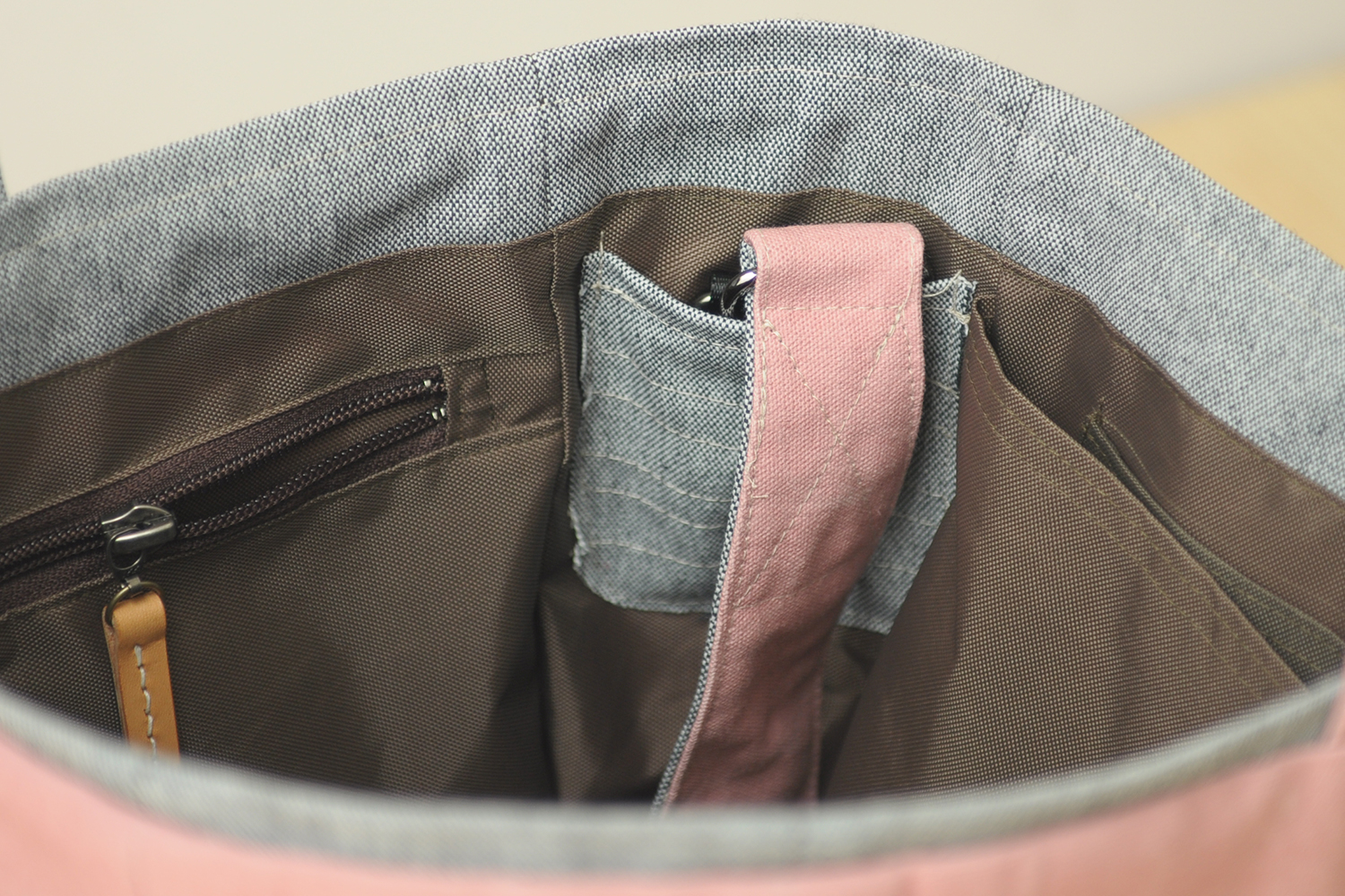 ※ 學習重點:方型包的袋底車縫,無接縫的背袋連接鉤環五金做法、拉鍊車縫、圓形口袋車縫,雙色材質內裡製作。