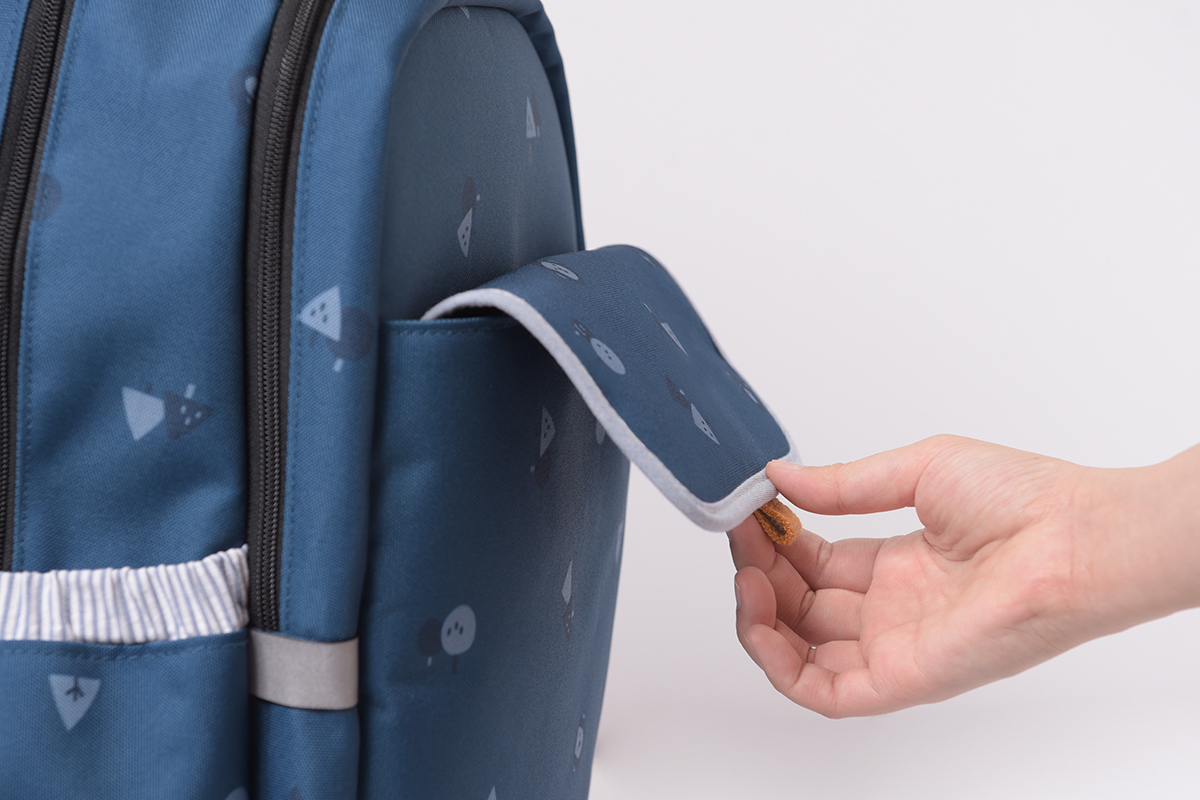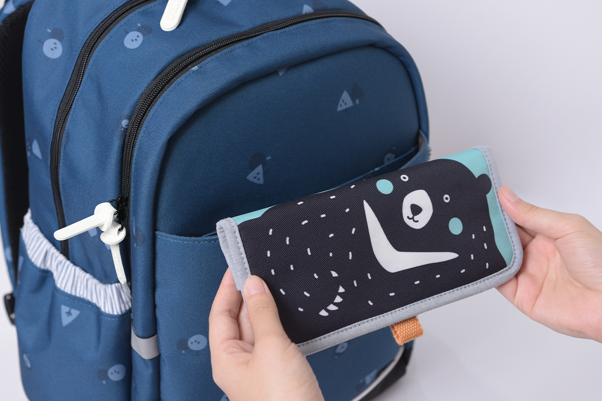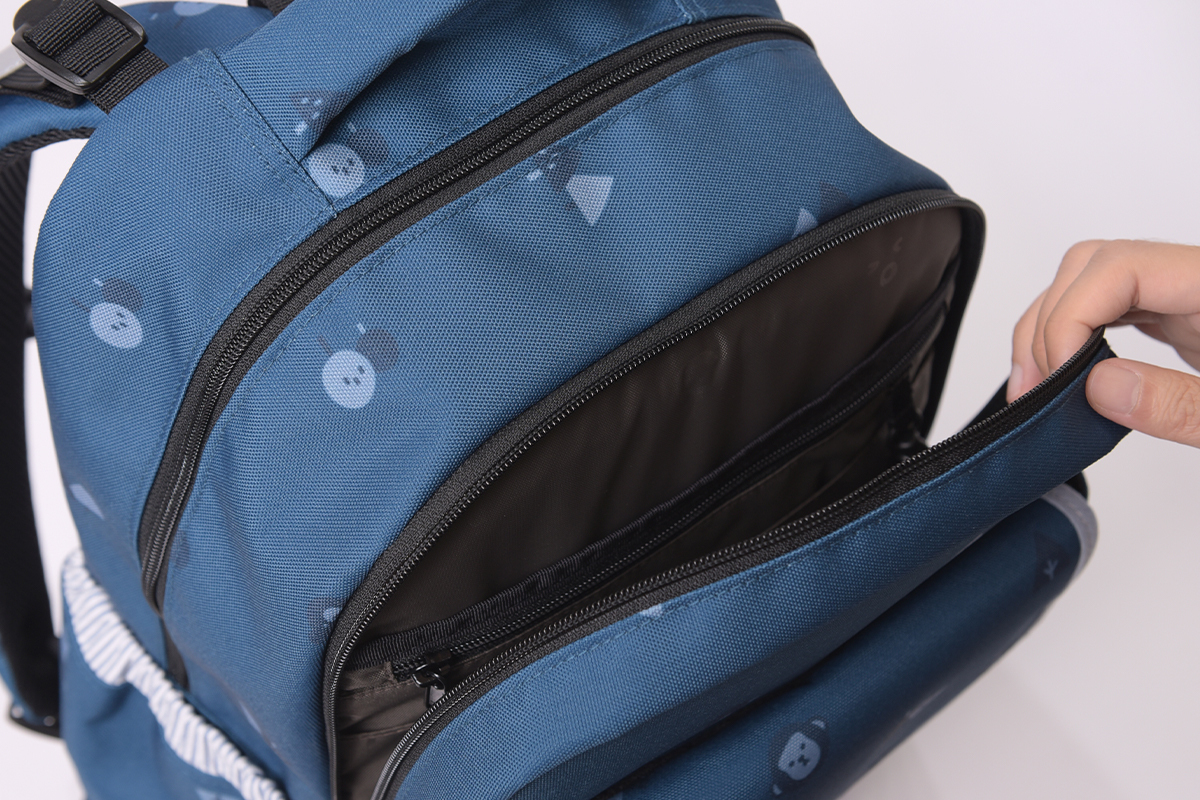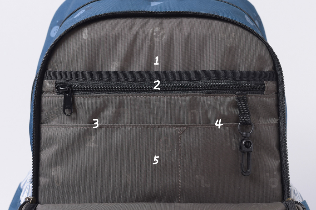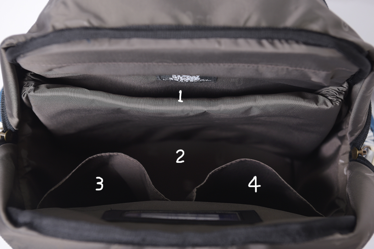 主袋身有專為孩子設計的四大收納空間,不多不少剛剛好,簡單明瞭的開放口袋,讓孩子學習收納不挫折。