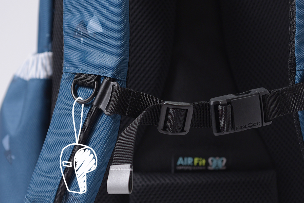 德國頂級 Fidlock磁吸胸扣,能將書包穩定的貼在後背上,揹負更省力,特殊的磁吸機構,上下一推就解開,小小指頭也能輕鬆使用,一碰就關上。