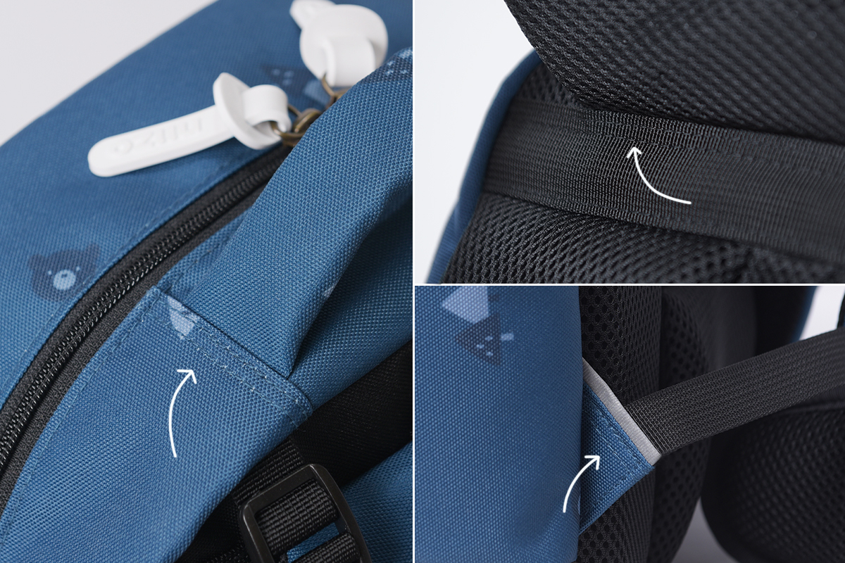 坊間強調護脊的書包動輒超過1公斤,為了增加背部硬質支撐、厚實泡棉、硬挺的袋身,大尺寸大容量及成長型的硬質調節機構等,都在增加書包的重量,我覺得這有些治標不治本。我們仔細盤整最重要的需求,設計適當的內口袋數量及書包尺寸、使用必要材質來做後背支撐,揹帶不需要用太厚太寬的泡棉,那樣反而會太硬,不適合小小的肩膀,為了減少過度的設計,反而每樣東西都要檢討它的必要性。