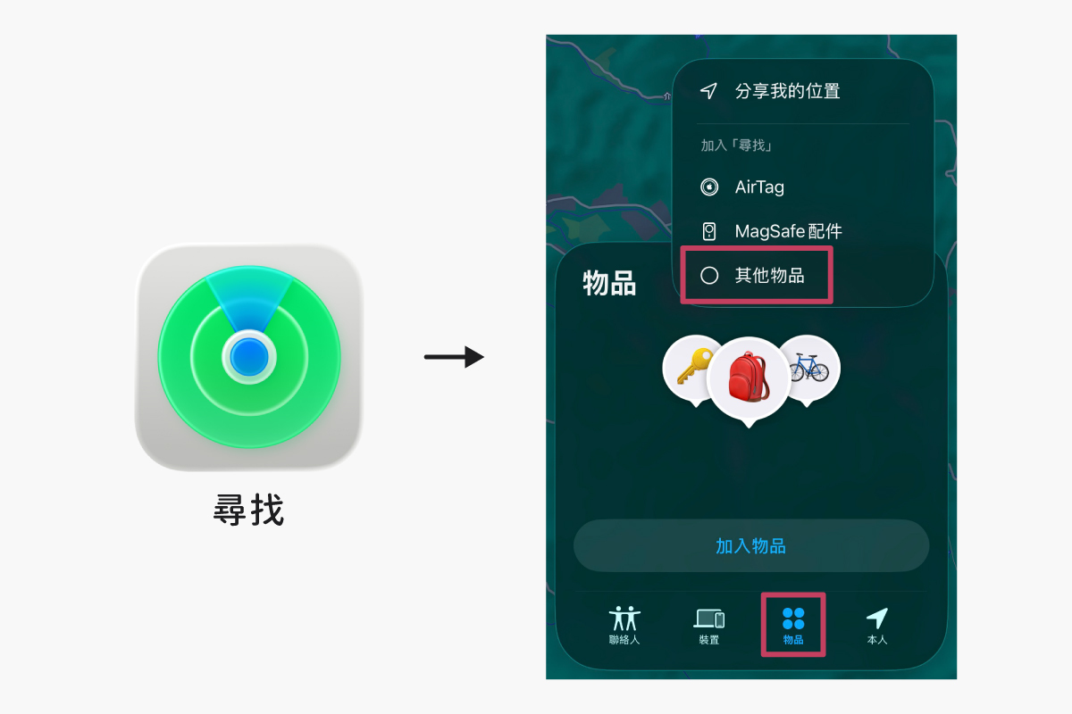 ❸ 切換至物品的選單,點選「加入物品」or「右上方的 + 」,最後再點選「其他支援的物品」,手機就會開始尋找T-Tag配對。