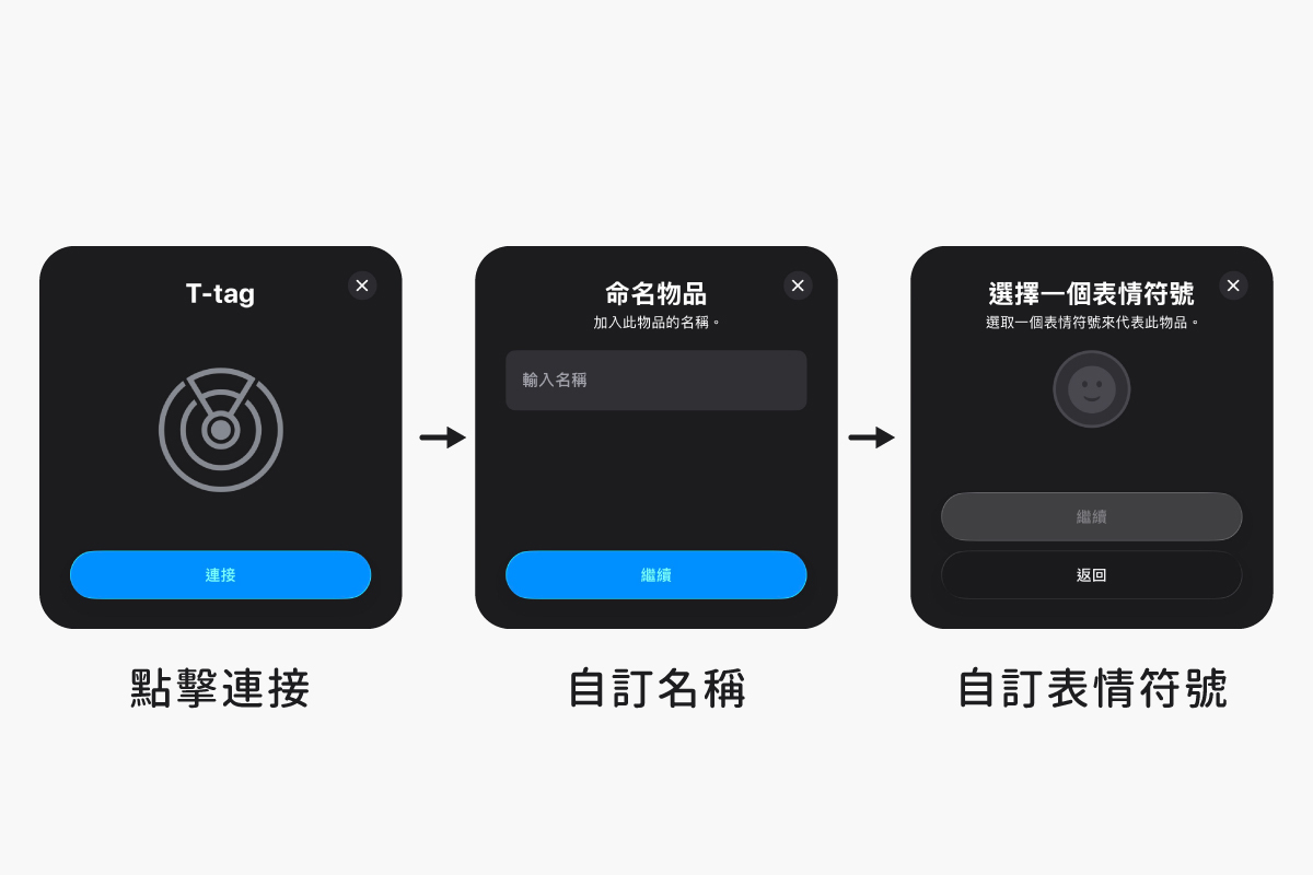 ❹ 將帶有T-Tag文字的設備點擊「連接」後,填寫物品名稱以及選擇一個表情符號。